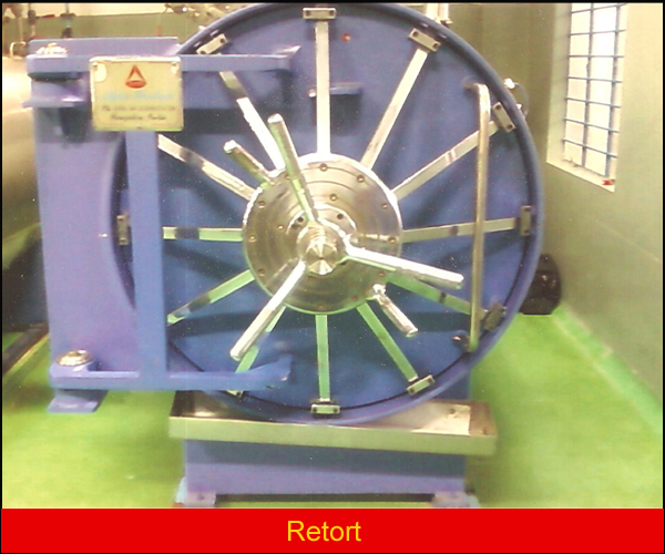 | Completely made of stainless steel, ceramic wool insulation with S.S. Cladding supplied with material loading S.S. basket for comfortable loading and unloading operations, water drain, gland nut provision, safety valves, vacuum breaker, 4” dia pressure gauges, railings, stoppers and other special fittings like built-in S.S. Plumbing line which has provisions for automatic steam / air injection through solenoid valves controlled by simple PLC or bypass system for manual operation. The steam and air drawn from external source is injected by specially designed nozzles for uniform distribution of temp. & pressure inside the chamber cooling water is sprayed specially designed sprinklers placed at suitable distance to cover all the area for rapid cooling within 10 mts though high pressure pump. The cold water inlet valve and the drain are manually operated. All the controls are done as per the chamber temperature. |